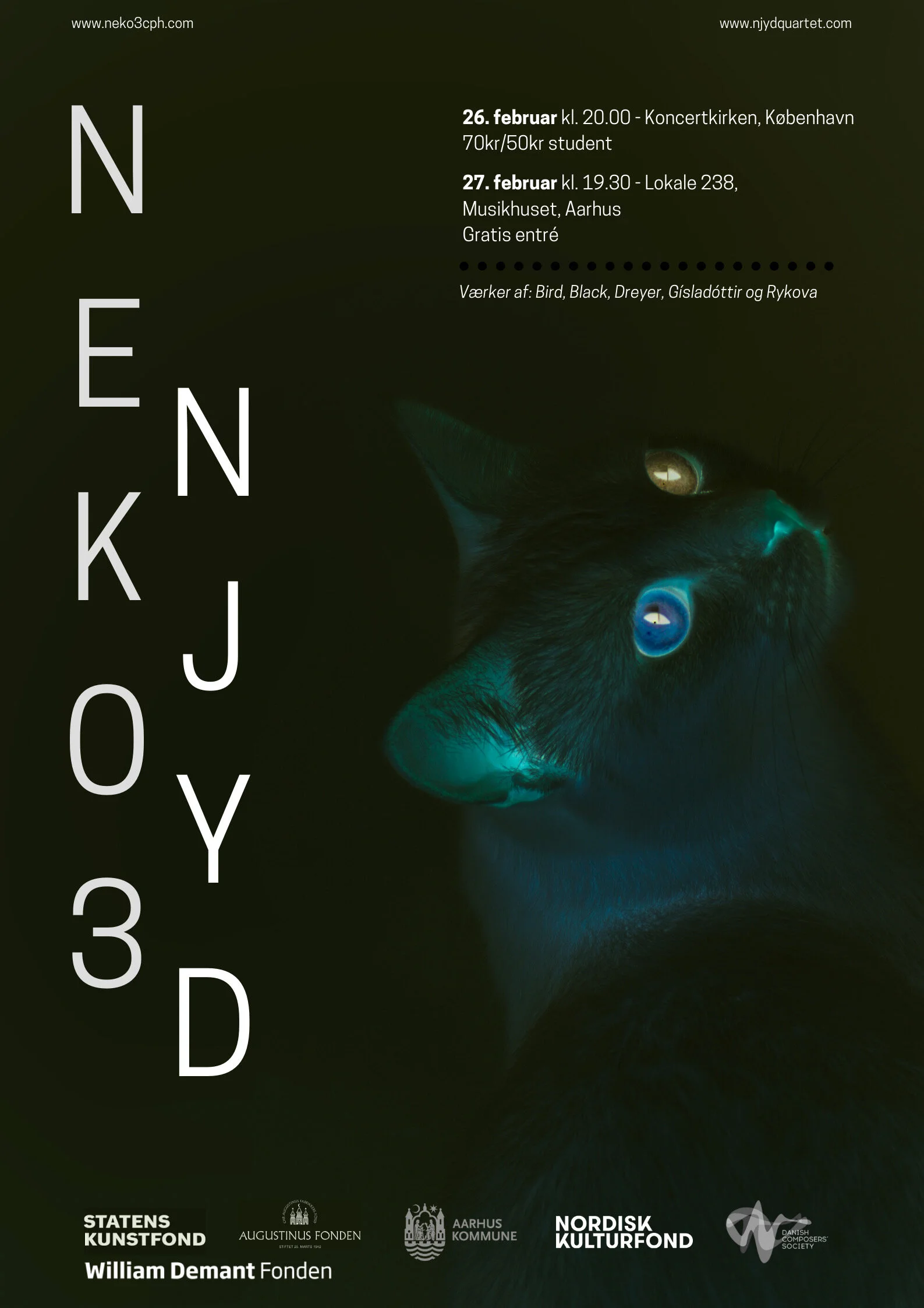 New and almost new works with different combinations of acustic instruments, electronics and video performed by the 2 Danish ensembles NEKO3 and NJYD.